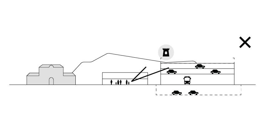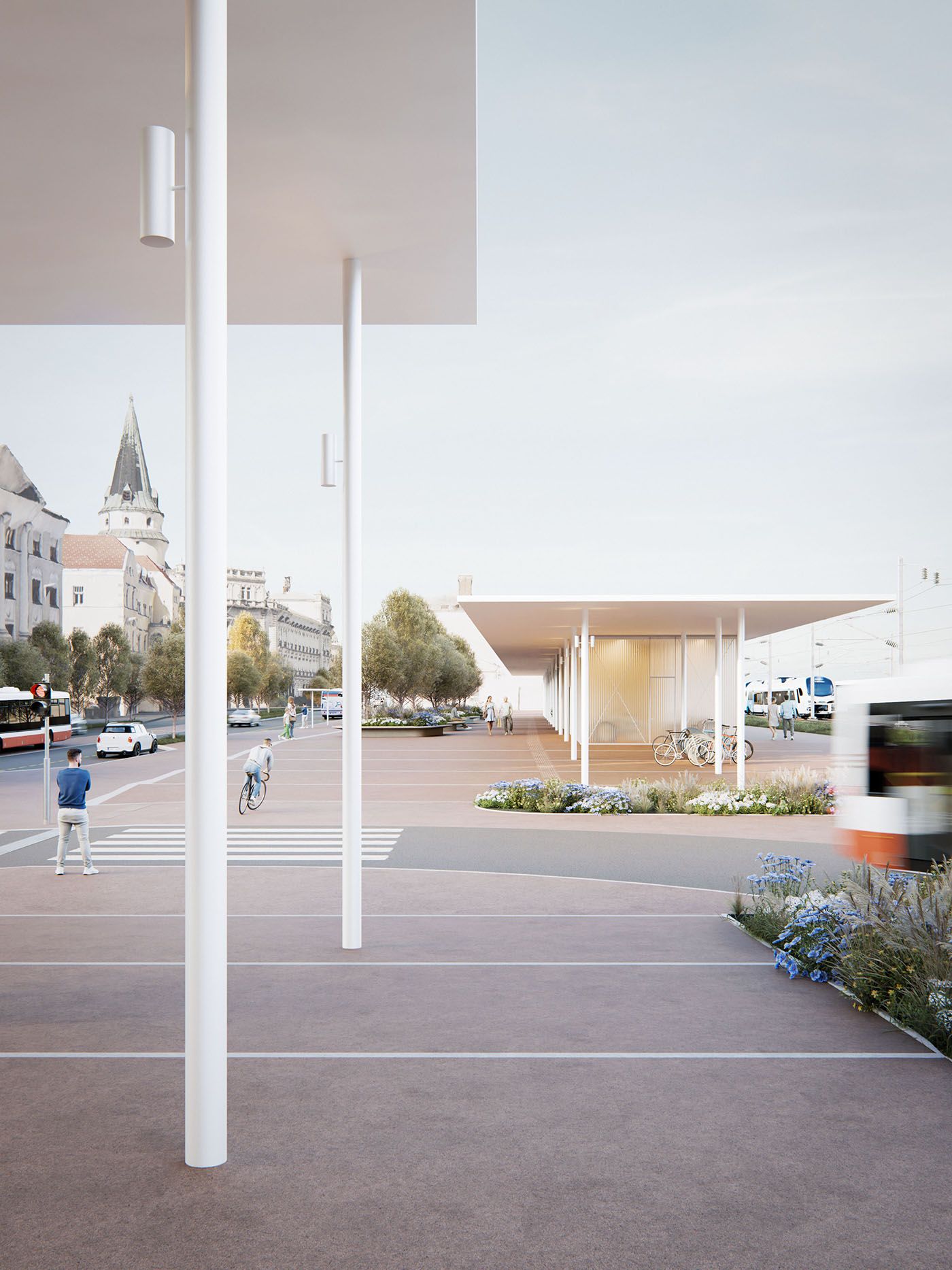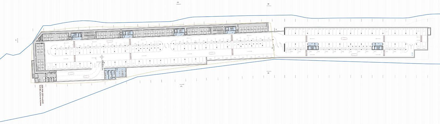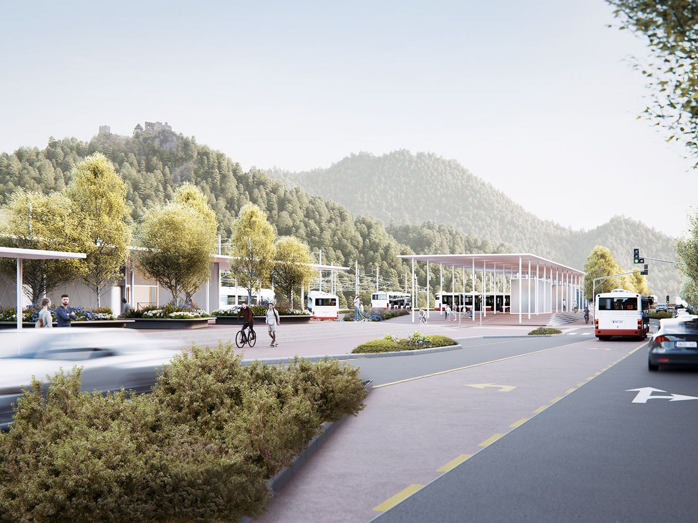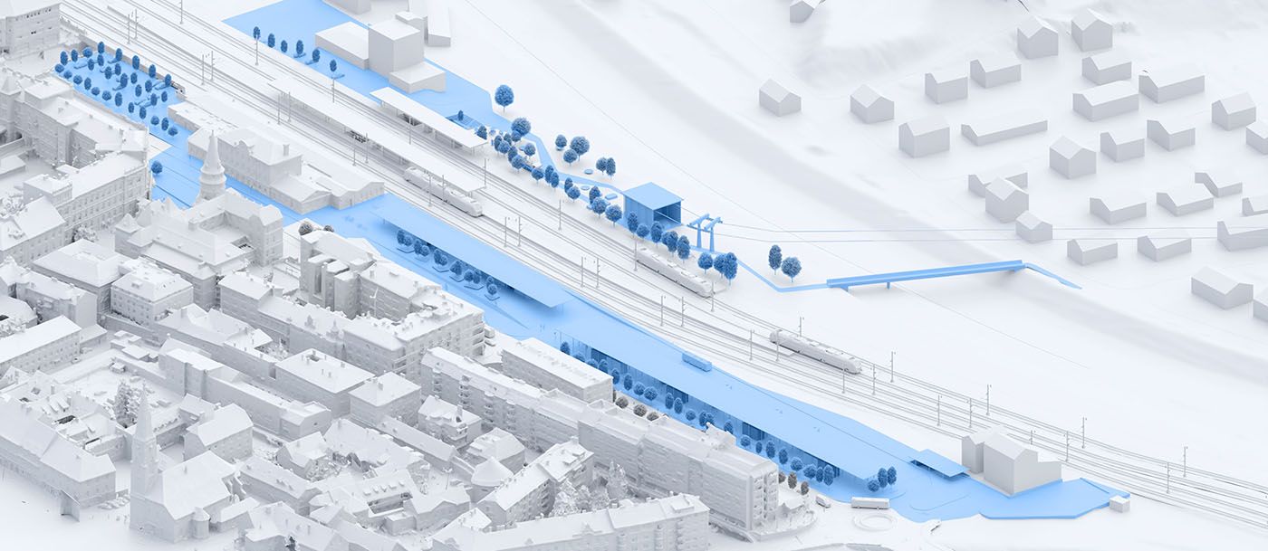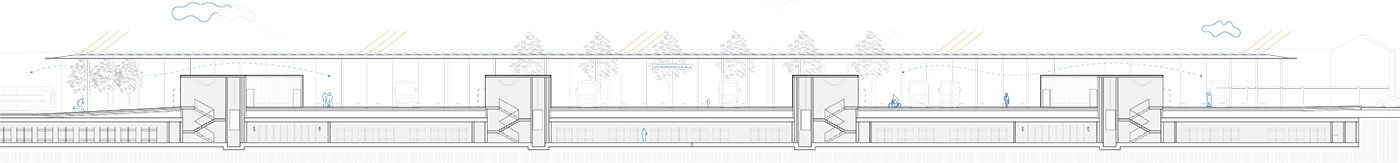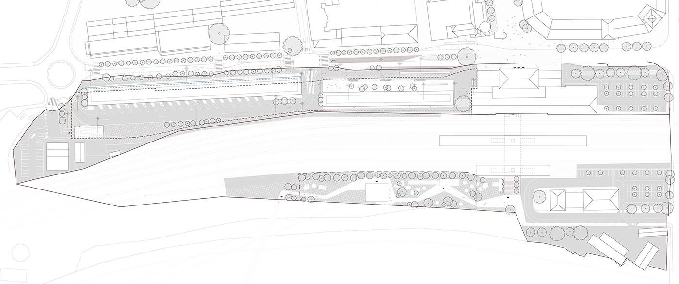 In urban and architectural design, we started from the context of the location. On the western side of the station lies the old town core, which includes the heritage-protected railway station at the northern edge of the plot. To the east, a vista opens up to the wooded hills and Celje Castle. The station stands alongside an important city artery—the XIV Division Street. Its façade and overall appearance significantly shape the experience of entering the city, thus creating a new character for the city. With the aim of minimizing built-up areas and designing space on a human scale, the entire parking garage is located in a single underground level. Due to the reduced surface development, XIV Division Street retains the character of a pleasant, green, and sunlit avenue. The new above-ground structure consists of two elongated, lightweight technical canopies at two heights. Together with the existing railway station, the canopies form a coherent urban and architectural composition. Between the buildings, a new green square is created, connecting the railway station, the bus station, and the service areas, while opening up towards the city.