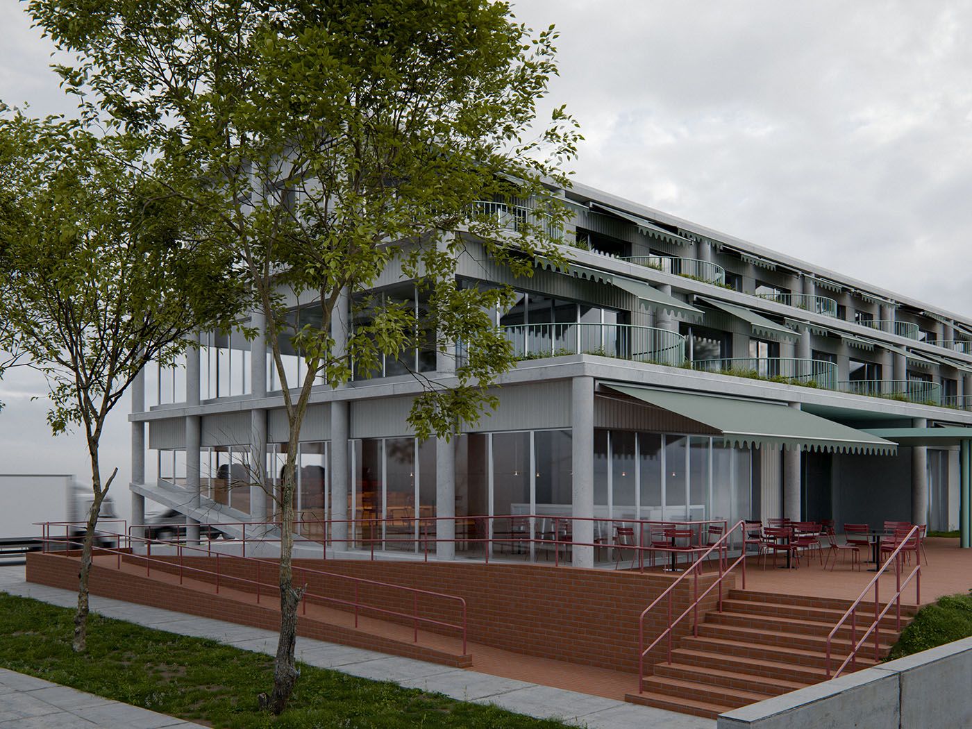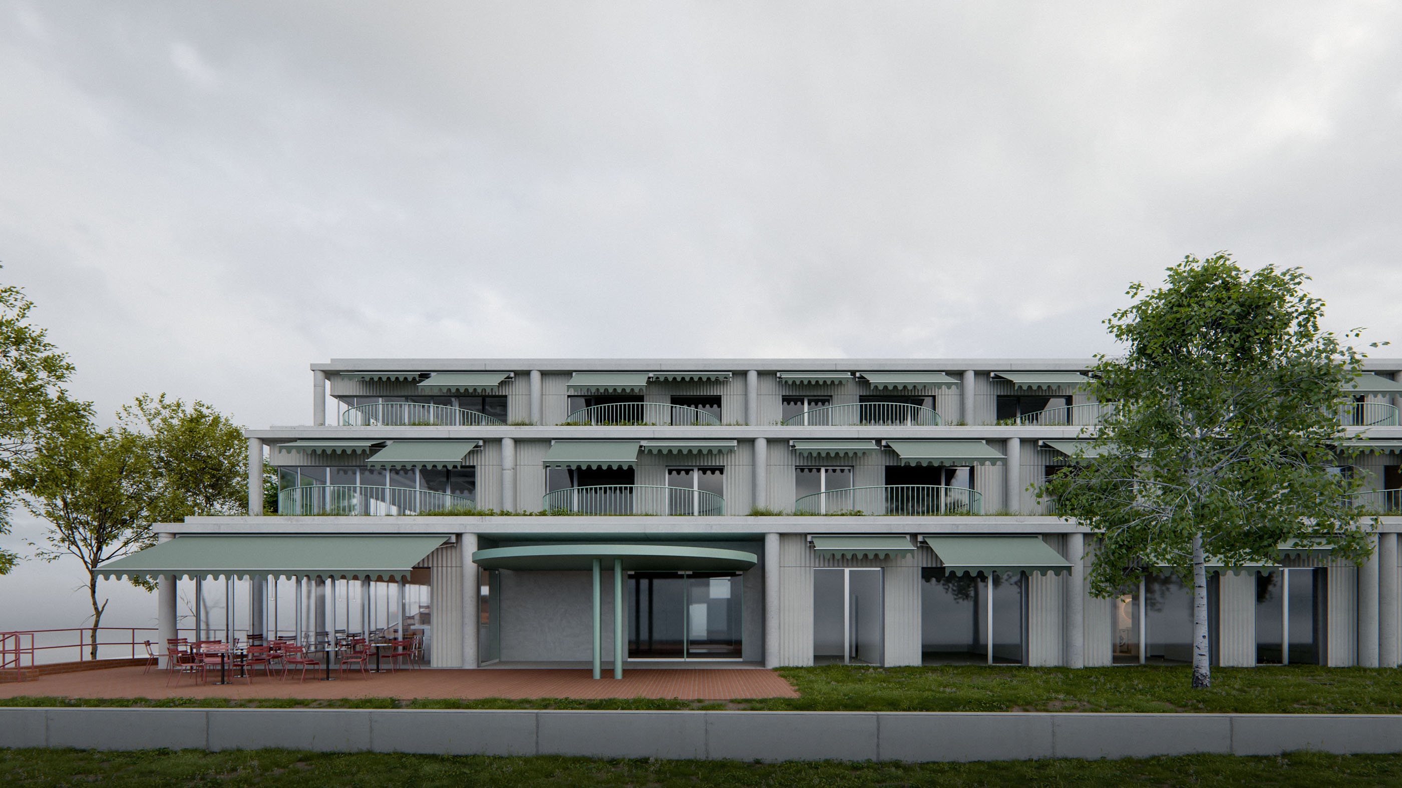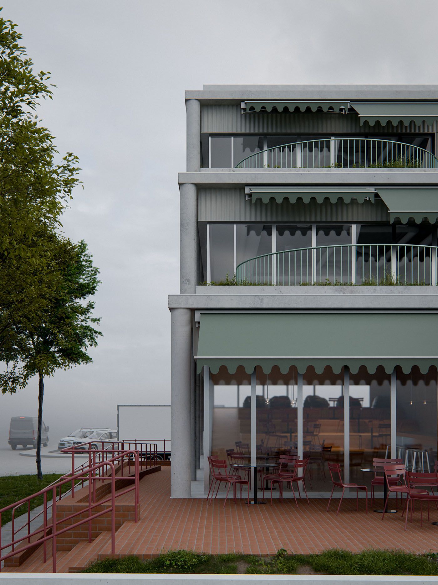 The Celovška Apart-Hotel is located in the industrial zone along Celovška cesta in Ljubljana. The building's footprint is defined by the building limit, as well as the maximum floor area prescribed by the zoning plan for the site. In order to be able to meet or not exceed the urban planning factors, the building has been designed as an elongated terraced volume. This architectural design allows the building to open to the south, to provide green terraces for all the occupants/users and to allow sufficient light for the whole building. The building consists of apartments, a public bar and community programme, a service area for the adjacent building's trucks, and a basement garage. The public bar and common areas are all oriented to the south-west and this functional design is also reflected on the façade. The materiality of the building is based on the site itself. It is characterised by a visible concrete structure, designed as a continuous grid of circular concrete columns. The façade infill consists of glass surfaces and composite panels. The industrial appearance of the building is softened by green terraces on the south side and planters on the north side of the building. The green elements of the building play an important role in creating better living conditions in surrounding industrial zone.