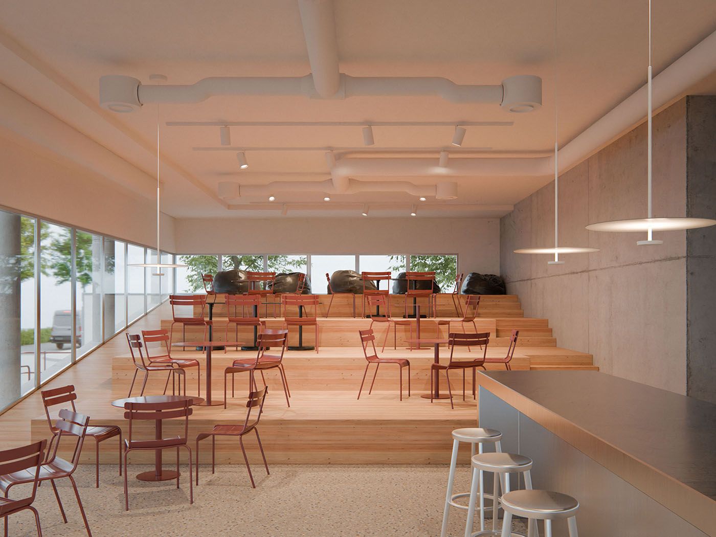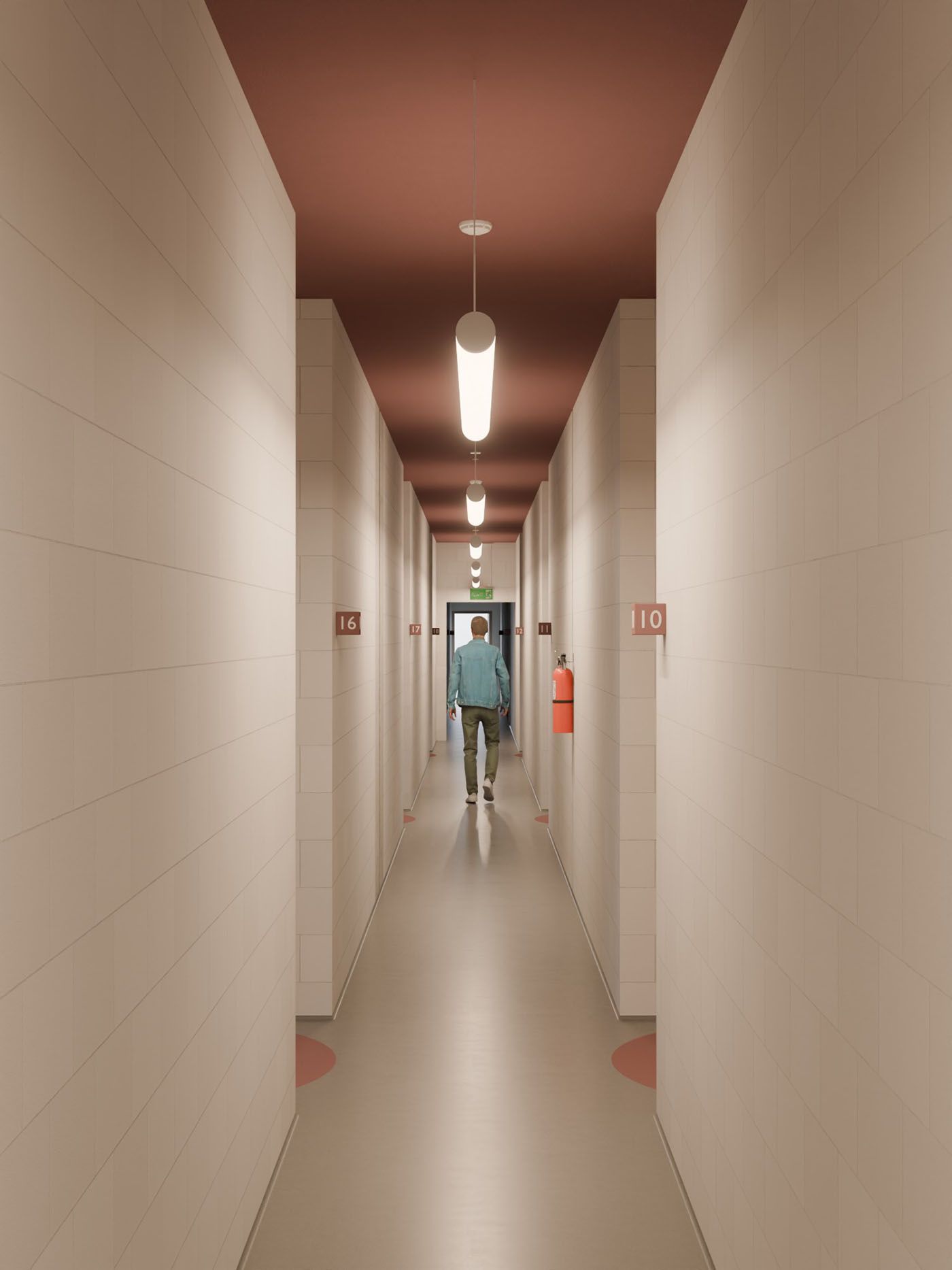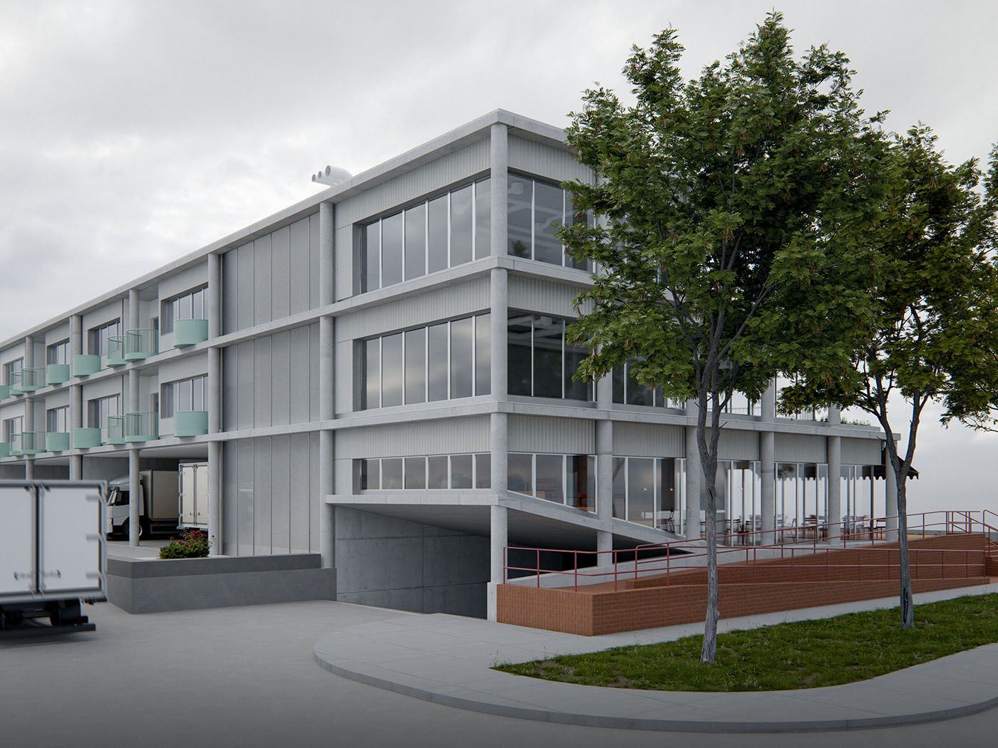 The Celovška Apart-Hotel is located in the industrial zone along Celovška cesta in Ljubljana. The building's footprint is defined by the building limit, as well as the maximum floor area prescribed by the zoning plan for the site. In order to be able to meet or not exceed the urban planning factors, the building has been designed as an elongated terraced volume. This architectural design allows the building to open to the south, to provide green terraces for all the occupants/users and to allow sufficient light for the whole building. The building consists of apartments, a public bar and community programme, a service area for the adjacent building's trucks, and a basement garage. The public bar and common areas are all oriented to the south-west and this functional design is also reflected on the façade. The materiality of the building is based on the site itself. It is characterised by a visible concrete structure, designed as a continuous grid of circular concrete columns. The façade infill consists of glass surfaces and composite panels. The industrial appearance of the building is softened by green terraces on the south side and planters on the north side of the building. The green elements of the building play an important role in creating better living conditions in surrounding industrial zone.